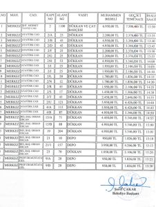 Mülkiyeti Belediyemize ait; muhtelif adreslerdeki 1 (Bir) adet Dükkan ve Çay bahçesi, 20 (Yirmi) adet Dükkan ve 4 (Dört) adet deponun 7 (yedi) yıllığına; 2886 sayılı Devlet İhale Kanununun 45’inci maddesi uyarınca açık artırma usulü ile ihaleye çıkartılmıştır.